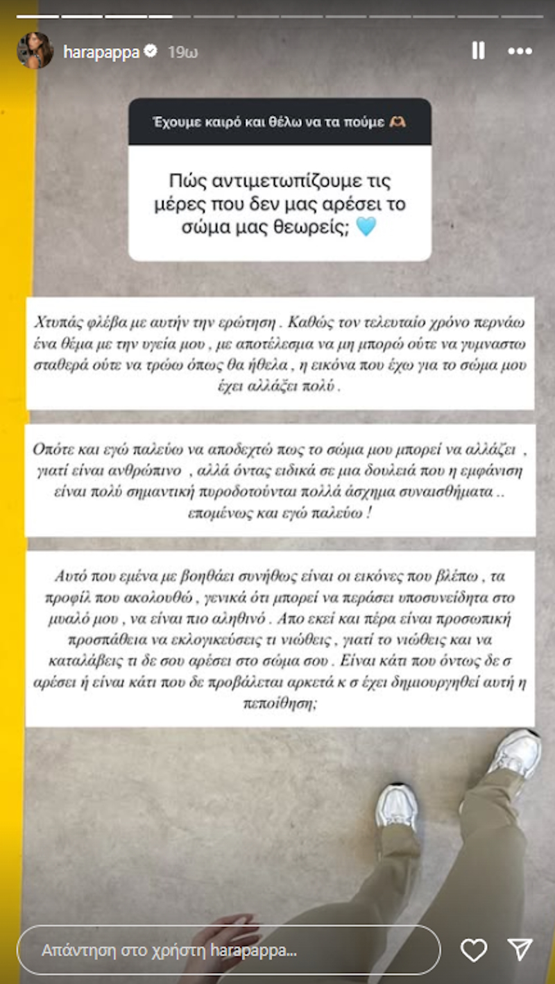 «Χτυπάς φλέβα με αυτήν την ερώτηση. Καθώς τον τελευταίο χρόνο περνάω ένα θέμα με την υγεία μου, με αποτέλεσμα να μην μπορώ ούτε να γυμναστώ σταθερά, ούτε να τρώω όπως θα ήθελα, η εικόνα που έχω για το σώμα μου έχει αλλάξει πολύ», έγραψε αρχικά στο story η Χαρά Παππα.