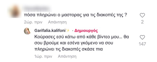 Η πρώην παίκτρια του GNTM δέχτηκε αρκετά σχόλια αμέσως μετά την ανάρτηση του βίντεο, μεταξύ των οποίων ήταν και αρκετά αρνητικά. Σε ένα από αυτά, κάποιος χρήστης του Tik Tok αναρωτήθηκε: “Πόσα πληρώνει ο Μάστορας για τις διακοπές της;”.
