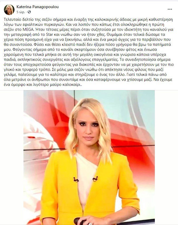 Το τελευταίο της δελτίο ειδήσεων για τη φετινή σεζόν παρουσίασε η Κατερίνα Παναγοπούλου το βράδυ του Σαββάτου 7 Αυγούστου στο MEGA. Η δημοσιογράφος και παρουσιάστρια του κεντρικού δελτίου ειδήσεων του Μεγάλου Καναλιού θέλησε, μάλιστα, να κάνει μια ιδιαίτερη αναφορά στον προσωπικό της λογαριασμό στο Facebook.
