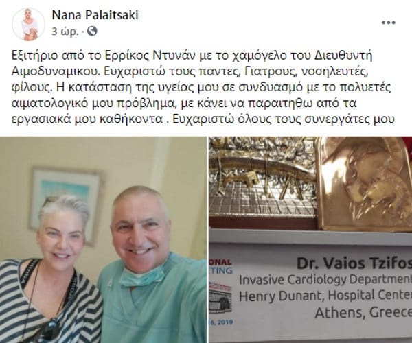 «Εξιτήριο από το Ερρίκος Ντυνάν με το χαμόγελο του Διευθυντή Αιμοδυναμικού. Ευχαριστώ τους πάντες, γιατρούς, νοσηλευτές, φίλους. Η κατάσταση της υγείας μου σε συνδυασμό με το πολυετές αιματολογικό μου πρόβλημα, με κάνει να παραιτηθώ από τα εργασιακά μου καθήκοντα . Ευχαριστώ όλους τους συνεργάτες μου», έγραψε η Νανά Παλαιτσάκη.