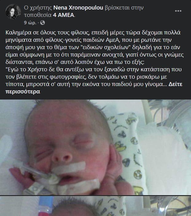 Αφορμή για αυτό στάθηκαν οι αλλαγές που εφαρμόζονται στην Παιδεία προς προστασία από την πανδημία για τον κορονοϊό. “Επειδή μέρες τώρα δέχομαι πολλά μηνύματα από φίλους – γονείς παιδιών ΑμεΑ, που με ρωτάνε την άποψή μου για το θέμα των “ειδικών σχολείων” δηλαδή για το εάν είμαι σύμφωνη με το ότι παρέμειναν ανοιχτά, γιατί όντως οι γνώμες διίστανται, επάνω σ’ αυτό λοιπόν έχω να πω το εξής” σημειώνει στο μήνυμα της.