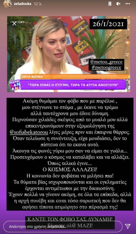 Τα θύματα βίας ισχυροποιούνται και οι εγκληματίες έρχονται αντιμέτωποι με την δικαιοσύνη. Έχουν πολλά να γίνουν ακόμη, σε όλα τα επίπεδα, αλλά η αρχή συνέβη και είναι τόσο σαρωτική που δεν θα αφήσει τίποτα ατιμώρητο το πέρασμά της», έγραψε η Ζέτα Δούκα.