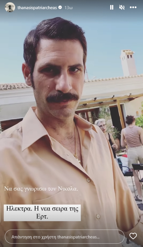 Μέσα από τον προσωπικό του λογαριασμό στο Instagram, ωστόσο, ένας γοητευτικός ηθοποιός ήρθε την Τρίτη να “προδώσει” τον ήρωα που θα ερμηνεύσει προσεχώς στη νέα σειρά. Ο λόγος για τον Θανάση Πατριαρχέα, ο οποίος και δημοσίευσε μια σύντομη ιστορία από τα γυρίσματα της “Ηλέκτρας” για την ΕΡΤ.