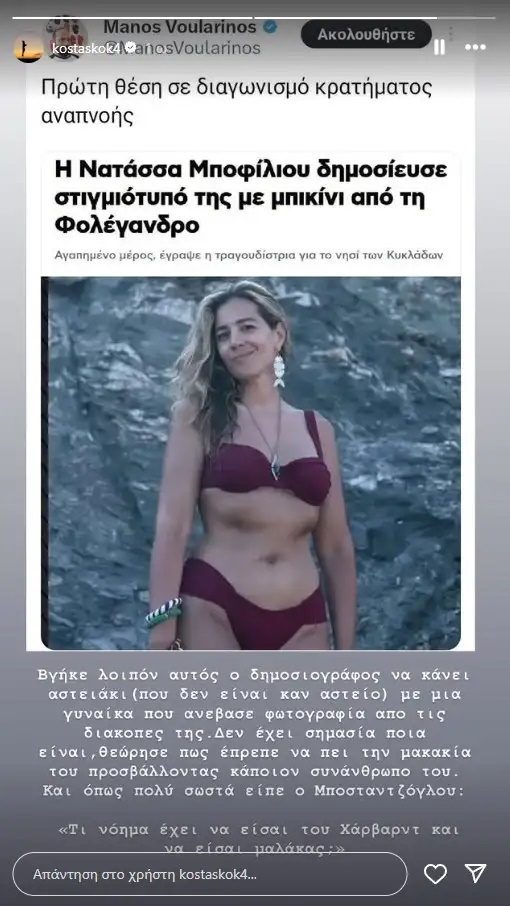 Αίσθηση έχει προκαλέσει τις τελευταίες ώρες στα social media το επίμαχο σχόλιο που έκανε ο Μάνος Βουλαρίνος σε βάρος της Νατάσας Μποφίλιου. Ο πρώην υδατοσφαιριστής, Κώστας Κοκκινάκης, πήρε ανοιχτά θέση υπέρ της τραγουδίστριας, κάνοντας ευθεία επίθεση στον δημοσιογράφο που θέλησε να κάνει χιούμορ με το σώμα και την εικόνα της.