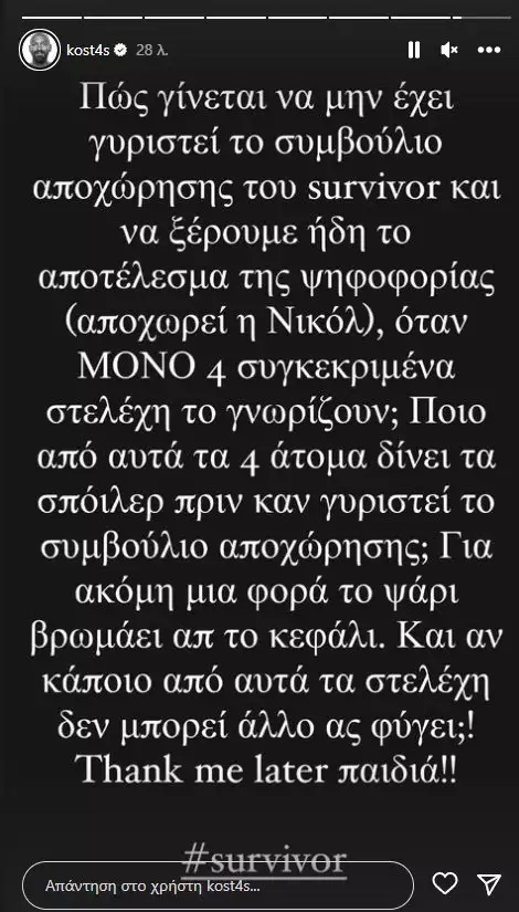 «Πώς γίνεται να μην έχει γυριστεί το συμβούλιο αποχώρησης του Survivor και να ξέρουμε ήδη το αποτέλεσμα της ψηφοφορίας (αποχωρεί η Νικόλ), όταν ΜΟΝΟ 4 συγκεκριμένα στελέχη το γνωρίζουν; Ποιο από αυτά τα 4 άτομα δίνει τα spoiler πριν καν γυριστεί το συμβούλιο αποχώρησης;