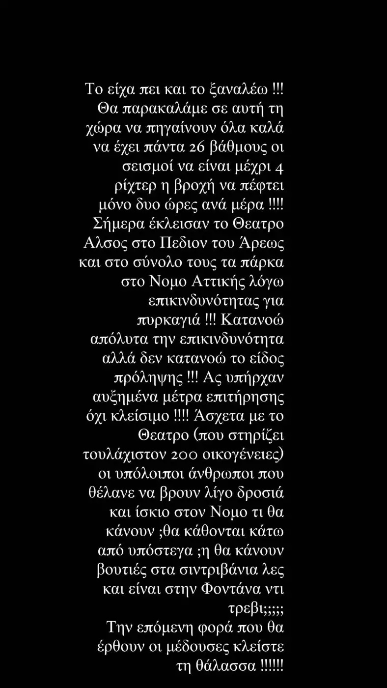 «Το είχα πει και το ξαναλέω. Θα παρακαλάμε σε αυτή τη χώρα να πηγαίνουν όλα καλά, να έχει πάντα 26 βαθμούς, οι σεισμοί να είναι μέχρι τέσσερα ρίχτερ, η βροχή να πέφτει μόνο δύο ώρες ανά μέρα. Σήμερα έκλεισαν το θέατρο Άλσος στο Πεδίον Άρεως και στο σύνολό τους τα πάρκα στο νομό Αττικής λόγω επικινδυνότητας για πυρκαγιά.