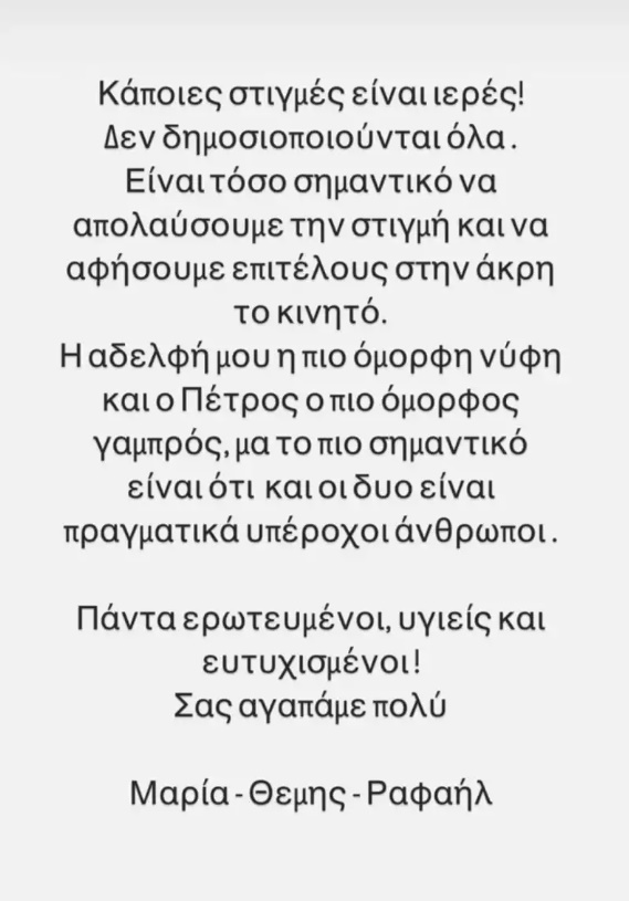 «Κάποιες στιγμές είναι ιερές! Δεν δημοσιοποιούνται όλα. Είναι τόσο σημαντικό να απολαύσουμε την στιγμή και να αφήσουμε επιτέλους στην άκρη το κινητό. Η αδερφή μου η πιο όμορφη νύφη και ο Πέτρος ο πιο όμορφος γαμπρός, μα το πιο σημαντικό είναι ότι οι δυο είναι πραγματικά υπέροχοι άνθρωποι.
