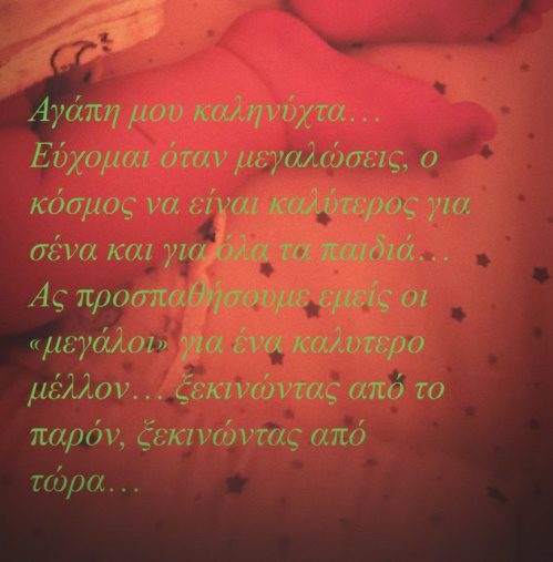 «Αγάπη μου καληνύχτα… Εύχομαι όταν μεγαλώσεις, ο κόσμος να είναι καλύτερος για σένα και για όλα τα παιδιά… Ας προσπαθήσουμε εμείς οι «μεγάλοι» για ένα καλύτερο μέλλον… Ξεκινώντας από το παρόν, ξεκινώντας από τώρα», έγραψε η Μαρία Ματσούκα.