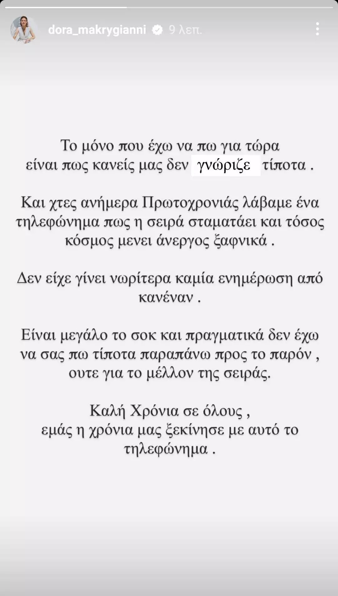 Είναι μεγάλο το σοκ και πραγματικά δεν έχω να σας πω τίποτα παραπάνω προς το παρόν, ούτε για το μέλλον της σειράς. Καλή χρονιά σε όλους, εμάς η χρονιά μας ξεκίνησε με αυτό το τηλεφώνημα» έγραψε η Ντόρα Μακρυγιάννη.