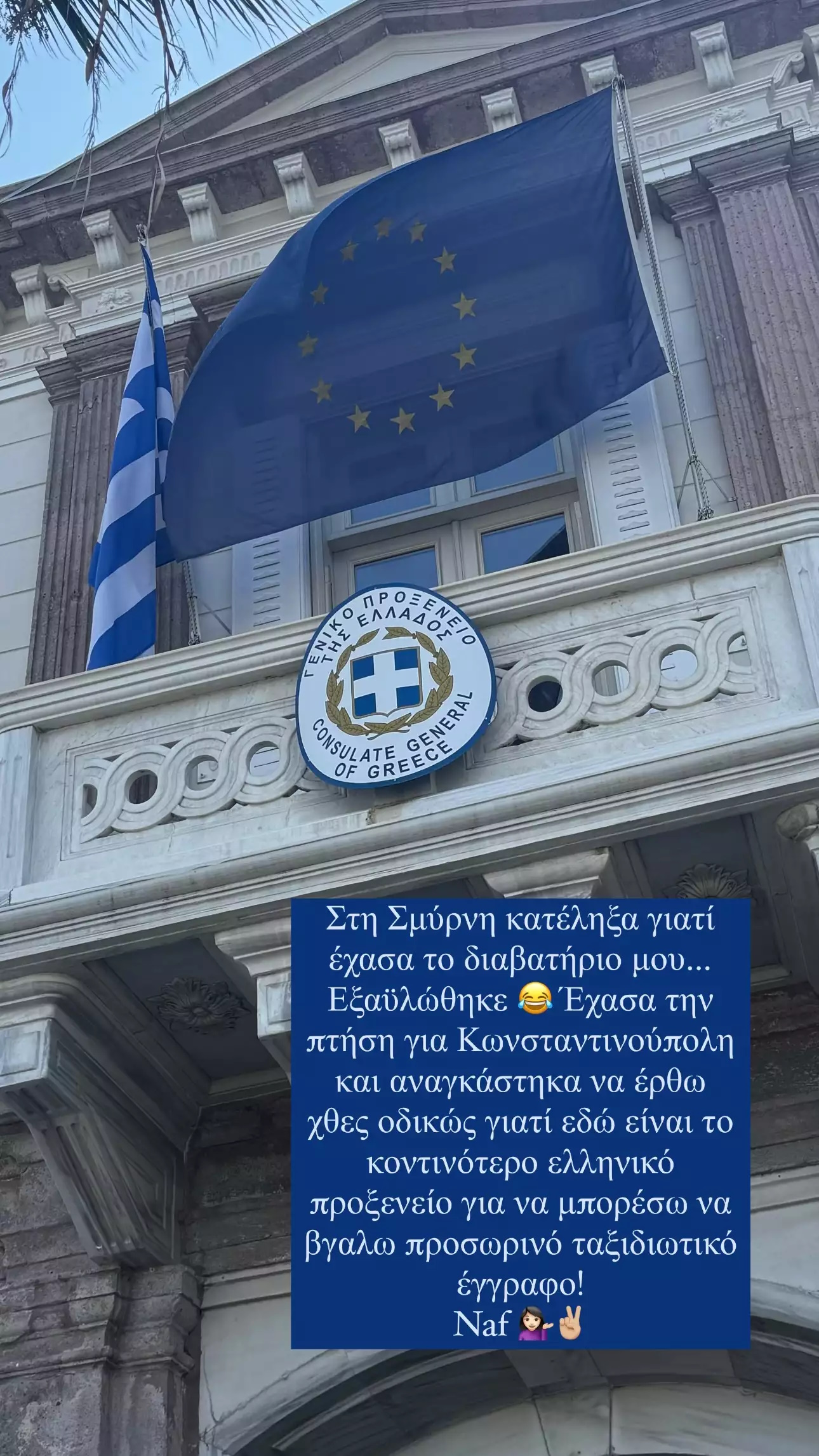 «Στη Σμύρνη κατέληξα γιατί έχασα το διαβατήριό μου. Εξαϋλώθηκε. Έχασα την πτήση για Κωνσταντινούπολη και αναγκάστηκα να έρθω χθες οδικώς γιατί εδώ είναι το κοντινότερο ελληνικό προξενείο για να μπορέσω να βγάλω προσωρινό ταξιδιωτικό έγγραφο» έγραψε στην ανάρτησή της η Ναυσικά Παναγιωτακοπούλου.