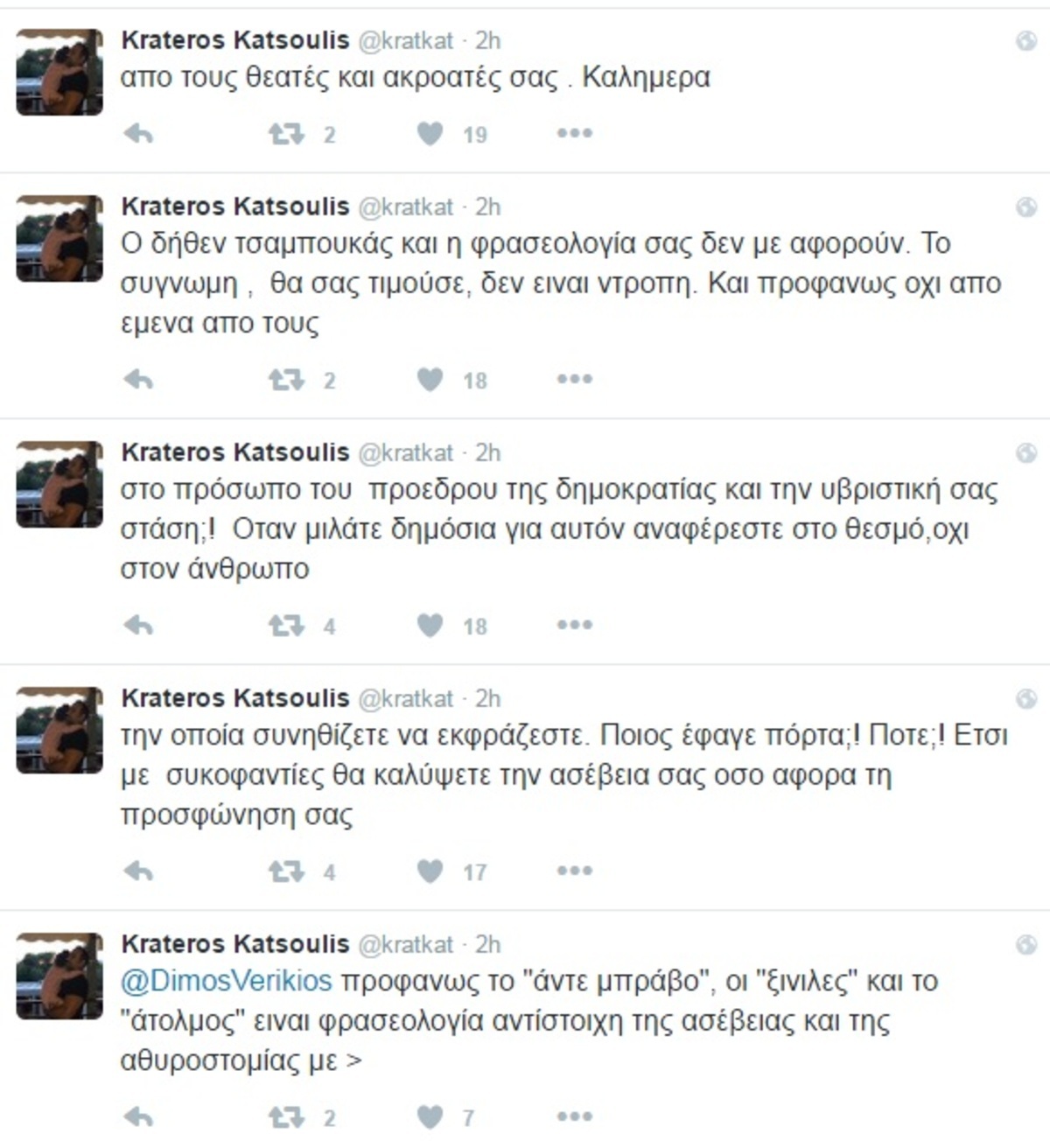 «Προφανώς το “άντε μπράβο”, οι “ξινίλες” και το “άτολμος” είναι φρασεολογία αντίστοιχη της ασέβειας και της αθυροστομίας με την οποία συνηθίζετε να εκφράζεστε. Ποιος έφαγε πόρτα;! Πότε;! Έτσι με συκοφαντίες θα καλύψετε την ασέβεια σας όσο αφορά τη προσφώνηση σας στο πρόσωπο του πρόεδρου της δημοκρατίας και την υβριστική σας στάση;! Όταν μιλάτε δημόσια για αυτόν αναφέρεστε στο θεσμό, όχι στον άνθρωπο. Ο δήθεν τσαμπουκάς και η φρασεολογία σας δεν με αφορούν. Το συγνώμη , θα σας τιμούσε, δεν είναι ντροπή. Και προφανώς όχι από εμένα από τους από τους θεατές και ακροατές σας . Καλημέρα»