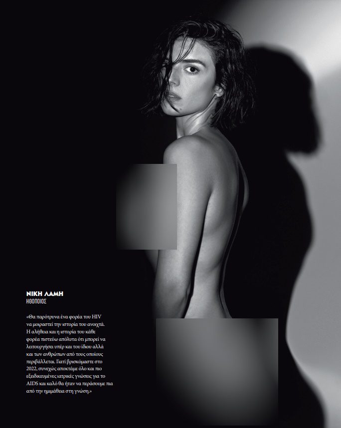 Με αφορμή την παγκόσμια ημέρα κατά του AIDS, 29 διάσημοι Έλληνες ποζάρουν γυμνοί στο φωτογραφικό φακό του Κοσμά Κουμιανού για το ετήσιο naked issue του Down Town. Η Νίκη Λάμη, λοιπόν, η οποία διανύει μια υπέροχη καλλιτεχνική σεζόν κερδίζοντας τις εντυπώσεις μέσα από τον κεντρικό της ρόλο στη σειρά “Μαίρη Μαίρη Μαίρη” του MEGA, γδύθηκε κι έστειλε το δικό της μήνυμα.