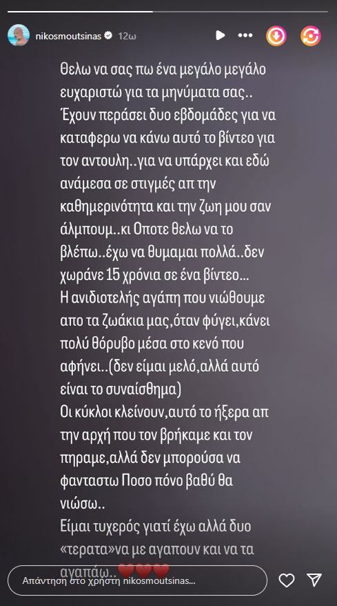 Η ανιδιοτελής αγάπη που νιώθουμε από τα ζωάκια μας, όταν φύγει, κάνει πολύ θόρυβο μέσα στο κενό που αφήνει.. (δεν είμαι μελό, αλλά αυτό είναι το συναίσθημα) Οι κύκλοι κλείνουν, αυτό το ήξερα απ’ την αρχή που τον βρήκαμε και τον πήραμε, αλλά δεν μπορούσα να φανταστώ, πόσο πόνο βαθύ θα νιώσω.. Είμαι τυχερός γιατί έχω αλλά δύο “τέρατα” να με αγαπούν και να τα αγαπάω..», έγραψε ο Νίκος Μουτσινάς.
