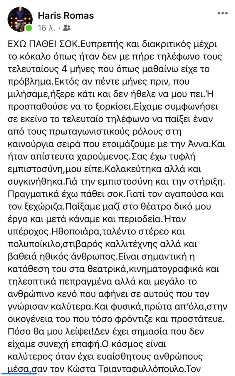 Πόσο θα μου λείψει! Δεν έχει σημασία που δεν είχαμε συνεχή επαφή. Ο κόσμος είναι καλύτερος όταν έχει ευαίσθητους ανθρώπους μέσα, σαν τον Κώστα Τριανταφυλλόπουλο. Τον Κώστα μας, που αποχαιρετώ σήμερα με ένα δάκρυ αληθινό» έγραψε ο Χάρης Ρώμας.