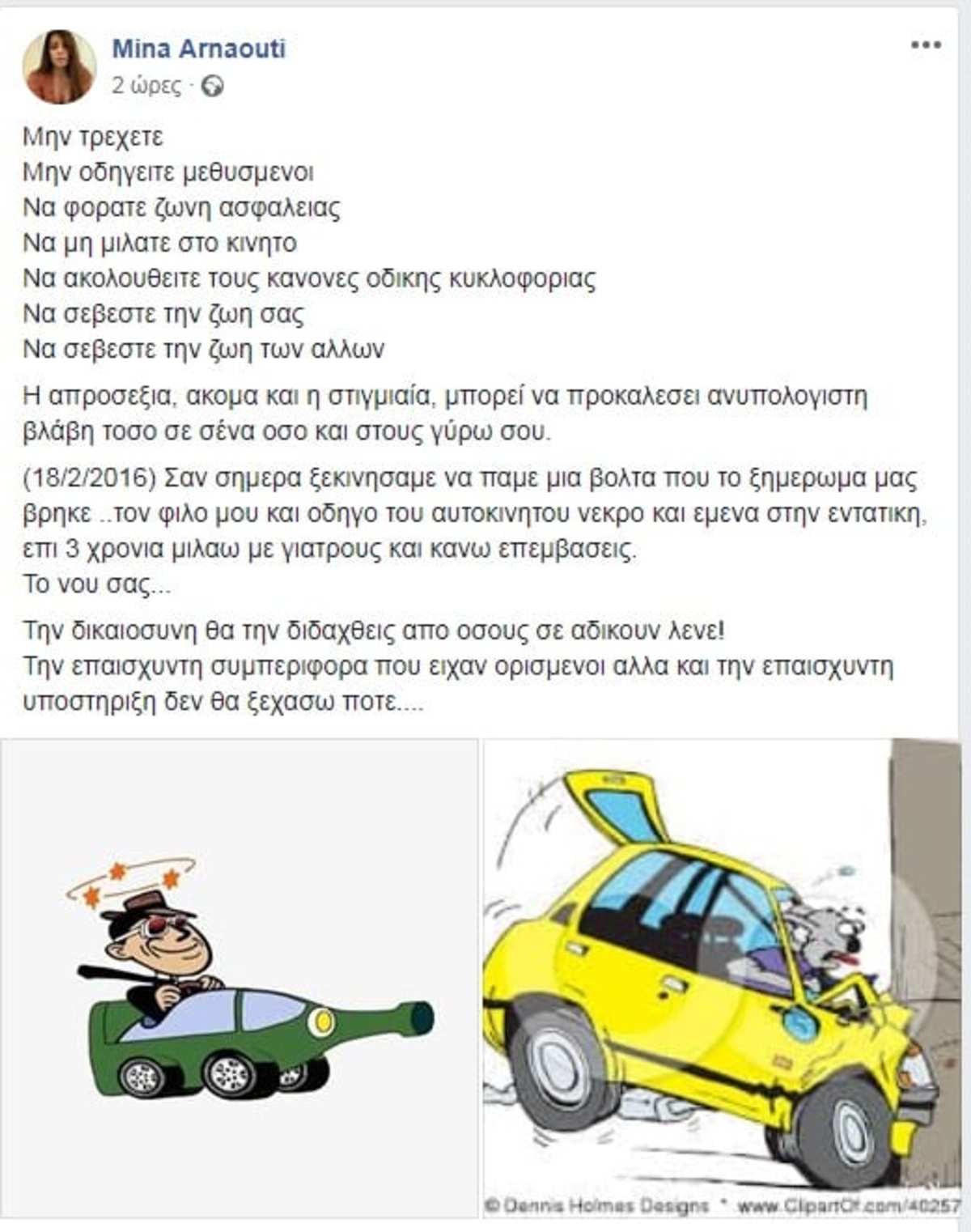 Η Μίνα Αρναούτη έκανε μια ανάρτηση στον προσωπικό της λογαριασμό στο facebook, όπου αναφέρθηκε σε εκείνο το μοιραίο πρωινό και έστειλε το δικό της μήνυμα σε όλο τον κόσμο.