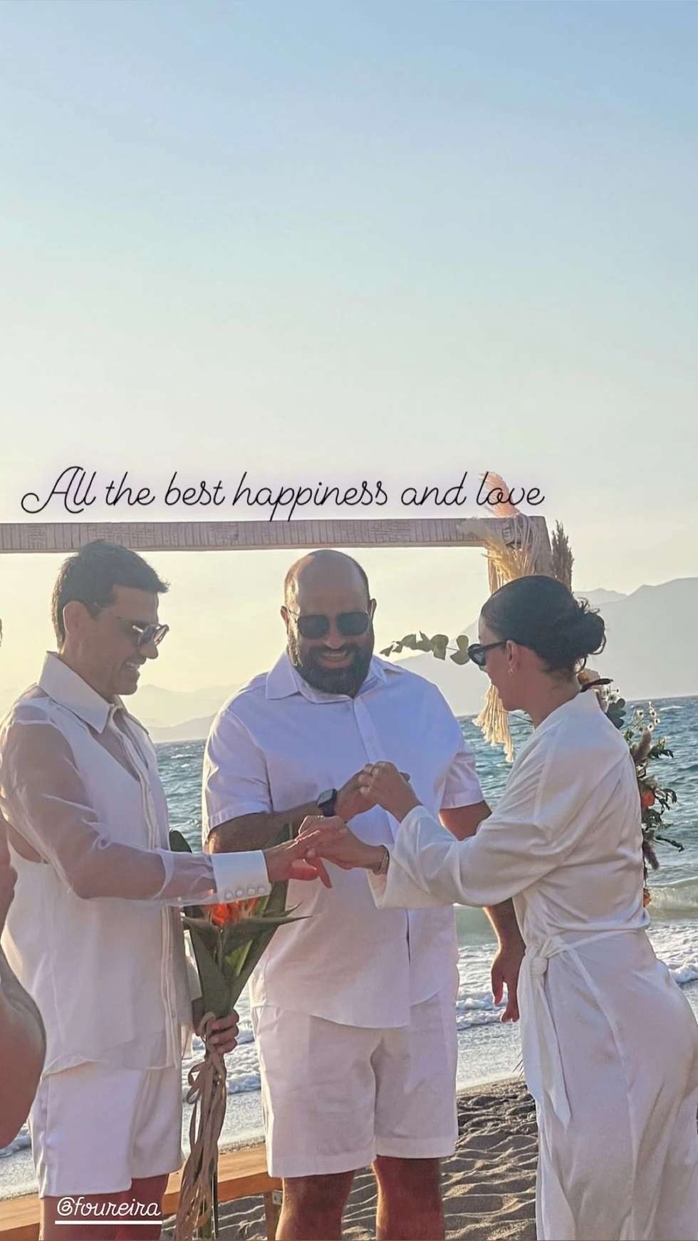 Ο γνωστός make-up artist συνοδεύτηκε από την κόρη του, ενώ ο σύντροφός του, Νάσος, τον περίμενε στην παραλία μαζί με τον γιο τους. Στα λευκά ήταν ντυμένη και η κουμπάρα του ζευγαριού, Ελένη Φουρέιρα, που πέρασε τις βέρες στο ζευγάρι μπροστά στη θάλασσα. Παρούσα στον γάμο και η Ιωάννα Σρόιτερ, που ανέβασε στιγμιότυπα σε stories στον λογαριασμό της στο Instagram.