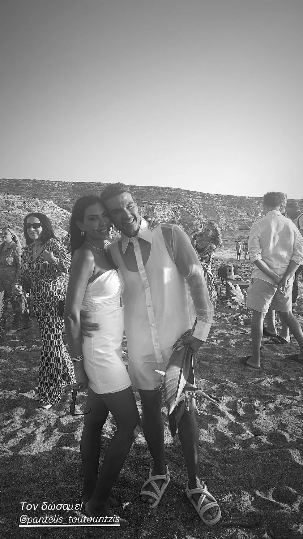 Με φόντο το υπέροχο ηλιοβασίλεμα, ο Παντελής Τουτουντζής έφτασε στην παραλία ντυμένος με λευκό see-through πουκάμισο, σορτς και rope σανδάλια στο ίδιο χρώμα, ενώ στα λευκά ήταν ντυμένοι και όλοι οι καλεσμένοι που τον περίμεναν σε ένα εντυπωσιακά διακοσμημένο boho σκηνικό.