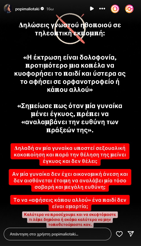 Θέση για τις δηλώσεις του Άρη Σερβετάλη για τις αμβλώσεις πήρε η Πόπη Μαλλιωτάκη. Με ανάρτηση που έκανε στον προσωπικό της λογαριασμό στο Instagram, η γνωστή τραγουδίστρια ξέσπασε κατά του ηθοποιού.