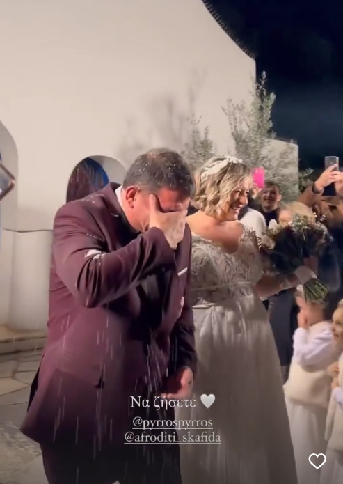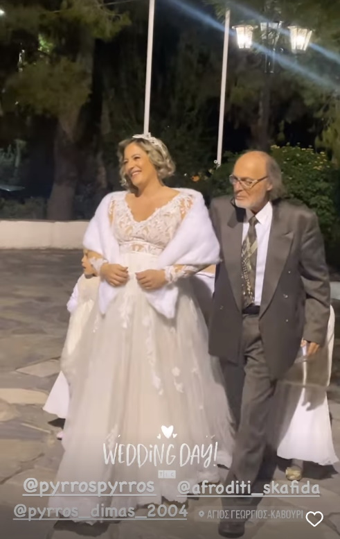 Με τα ιερά δεσμά του γάμου ενώθηκαν ο Πύρρος Δήμας και η Αφροδίτη Σκαφίδα το απόγευμα του Σαββάτου. Λίγους μήνες πριν έρθει στον κόσμο το μωράκι του, το ερωτευμένο ζευγάρι αποφάσισε να κάνει αυτό το βήμα στη σχέση του στον Άγιο Γεώργιο στο Καβούρι παρουσία στενών φίλων και συγγενών.