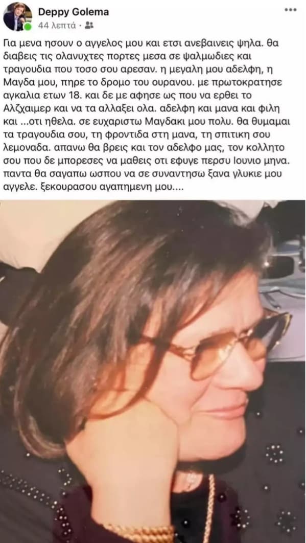 Αδερφή και μάνα και φίλη και ότι ήθελα. Σε ευχαριστώ Μαγδάκι μου πολύ. Θα θυμάμαι τα τραγούδια σου, τη φροντίδα στη μάνα, τη σπιτική σου λεμονάδα. Απάνω θα βρεις και τον αδερφό μας, τον κολλητό σου που δεν μπόρεσες να μάθεις ότι έφυγε πέρσι Ιούνιο μήνα. Πάντα θα σ’ αγαπώ ώσπου να σε συναντήσω ξανά γλυκιέ μου άγγελε. Ξεκουράσου αγαπημένη μου”.