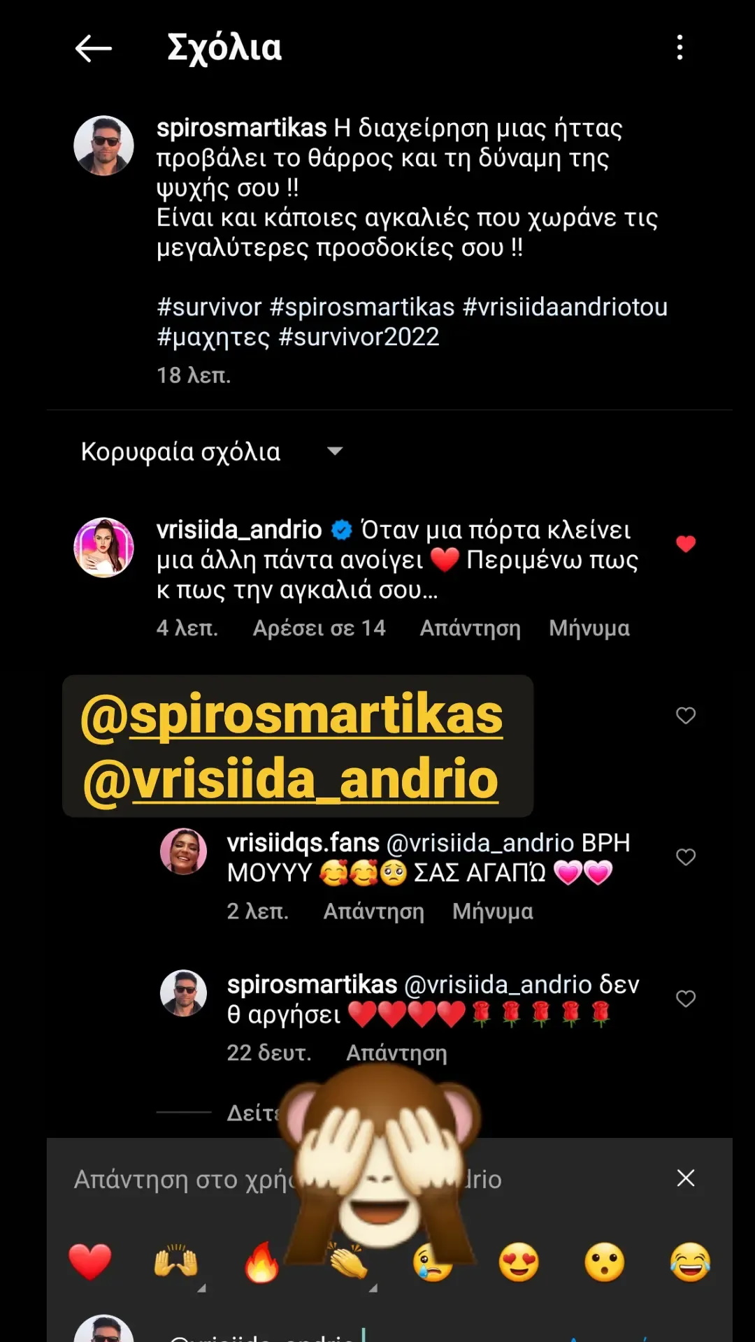 Την πρώτη του ανάρτηση με την Βρισηίδα Ανδριώτου έκανε ο Σπύρος Μαρτίκας μετά την αποχώρησή του από το Survivor. Οι δυο τους είχαν έρθει πολύ κοντά στο παιχνίδι κι ένα ειδύλλιο φάνηκε ότι γεννιέται. Ο Σπύρος επέλεξε ένα στιγμιότυπό τους από το Survivor και συνόδευσε την ανάρτησή του με ένα πολύ τρυφερό μήνυμα.