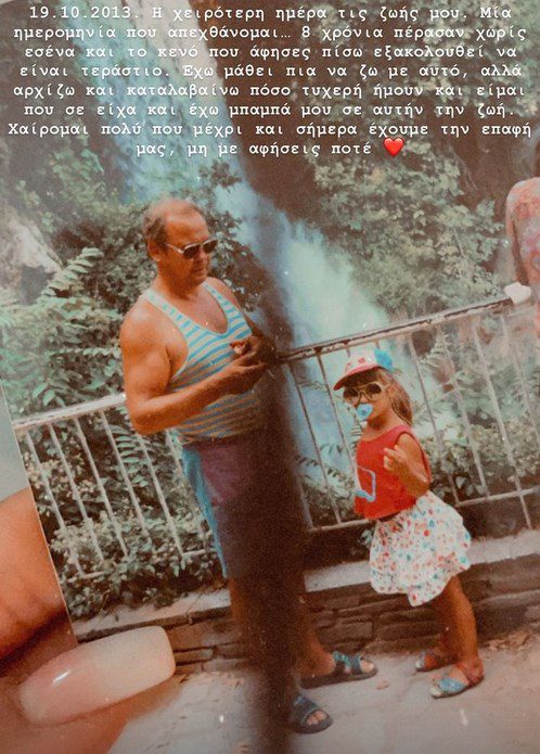 “8 χρόνια πέρασαν χωρίς εσένα και το κενό που άφησες πίσω εξακολουθεί να είναι τεράστιο. Έχω μάθει πια να ζω με αυτό, αλλά αρχίζω και καταλαβαίνω πόσο τυχερή ήμουν και είμαι που σε είχα και έχω μπαμπά μου σε αυτήν τη ζωή. Χαίρομαι πολύ που μέχρι και σήμερα έχουμε την επαφή μας, μη με αφήσεις ποτέ” συμπλήρωσε η Λάουρα Νάργες.