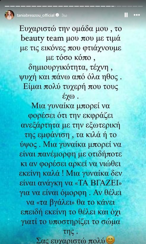 Μία γυναίκα μπορεί να είναι πανέμορφη με οτιδήποτε κι αν φορέσει αρκεί να νιώθει καλά. Μια γυναίκα δεν είναι ανάγκη να τα βγάζει για να είναι όμορφη. Αν θέλει να τα βγάλει θα το κάνει επειδή εκείνη το θέλει και όχι γιατί το υποστηρίζει το σώμα της. Σας ευχαριστώ πολύ», έγραψε με νόημα η Τάνια Μπρεάζου.