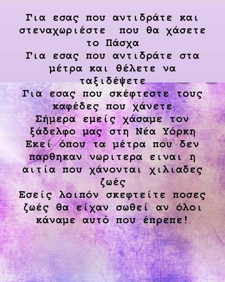 Με μια ανάρτησή τους στο προσωπικό τους προφίλ στα social media, οι αδελφές Ράντη, Βαλεντίνη και Αγάθη μοιράστηκαν μαζί μας το δυσάρεστο νέο. Οι δυο δημοσιογράφοι έχασαν τον ξάδελφό τους από κορονοϊό, ο οποίος ζούσε στη Νέα Υόρκη.
