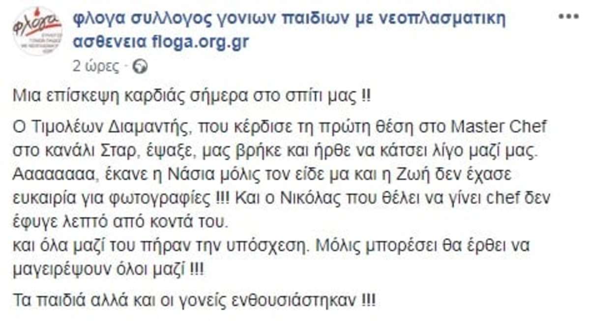 «Είχα πει όταν δήλωσα συμμετοχή στο Masterchef το πρώτο πράγμα που θα κάνω αν κερδίσω, είναι να βοηθήσω παιδιά που δίνουν μάχη για αυτό που μας έχει δώσει απλόχερα ο Θεός.. Την ΖΩΗ μας!
