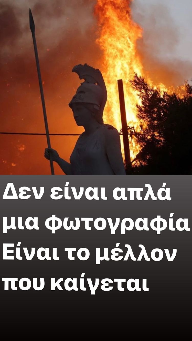 Η τραγουδίστρια, αν και δεν παίρνει συχνά θέση μέσω των social media, σε σημαντικά θέματα, όπως αυτά των τελευταίων ωρών, εκφράζει την άποψή της και στέλνει το δικό της μήνυμα. Συγκεκριμένα για την ανάρτησή της επέλεξε μία φωτογραφία από τις πυρκαγιές κι έγραψε: “Δεν είναι απλά μια φωτογραφία. Είναι το μέλλον που καίγεται.”