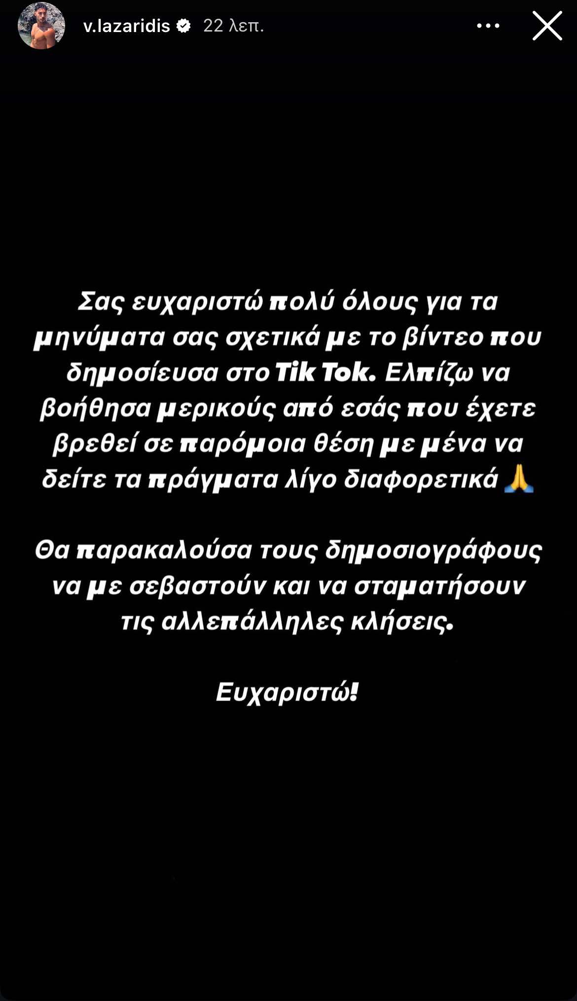 “Σας ευχαριστώ πολύ όλους για τα μηνύματά σας σχετικά με το βίντεο που δημοσίευσα στο TikTok. Ελπίζω να βοήθησα μερικούς από εσάς που έχετε βρεθεί σε παρόμοια θέση με μένα, να δείτε τα πράγματα λίγο διαφορετικά”, γράφει ο Βασίλης Λαζαρίδης σε Insta-story του το απόγευμα της Πέμπτης (20/3).