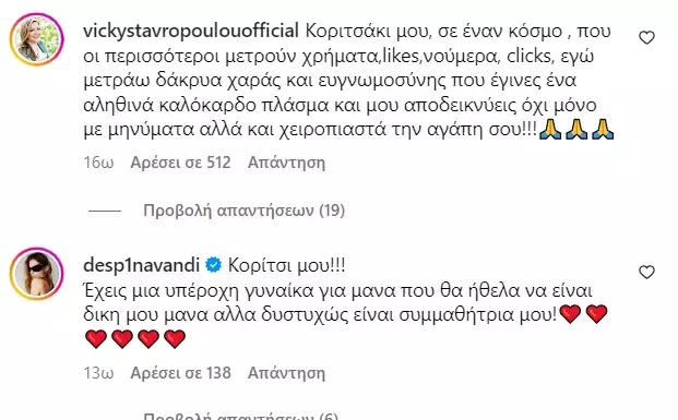 «Κοριτσάκι μου, σε έναν κόσμο, που οι περισσότεροι μετρούν χρήματα, likes, νούμερα, clicks, εγώ μετράω δάκρυα χαράς και ευγνωμοσύνης που έγινες ένα αληθινά καλόκαρδο πλάσμα και μου αποδεικνύεις όχι μόνο με μηνύματα αλλά και χειροπιαστά την αγάπη σου!!!» έγραψε η Βίκυ Σταυροπούλου.