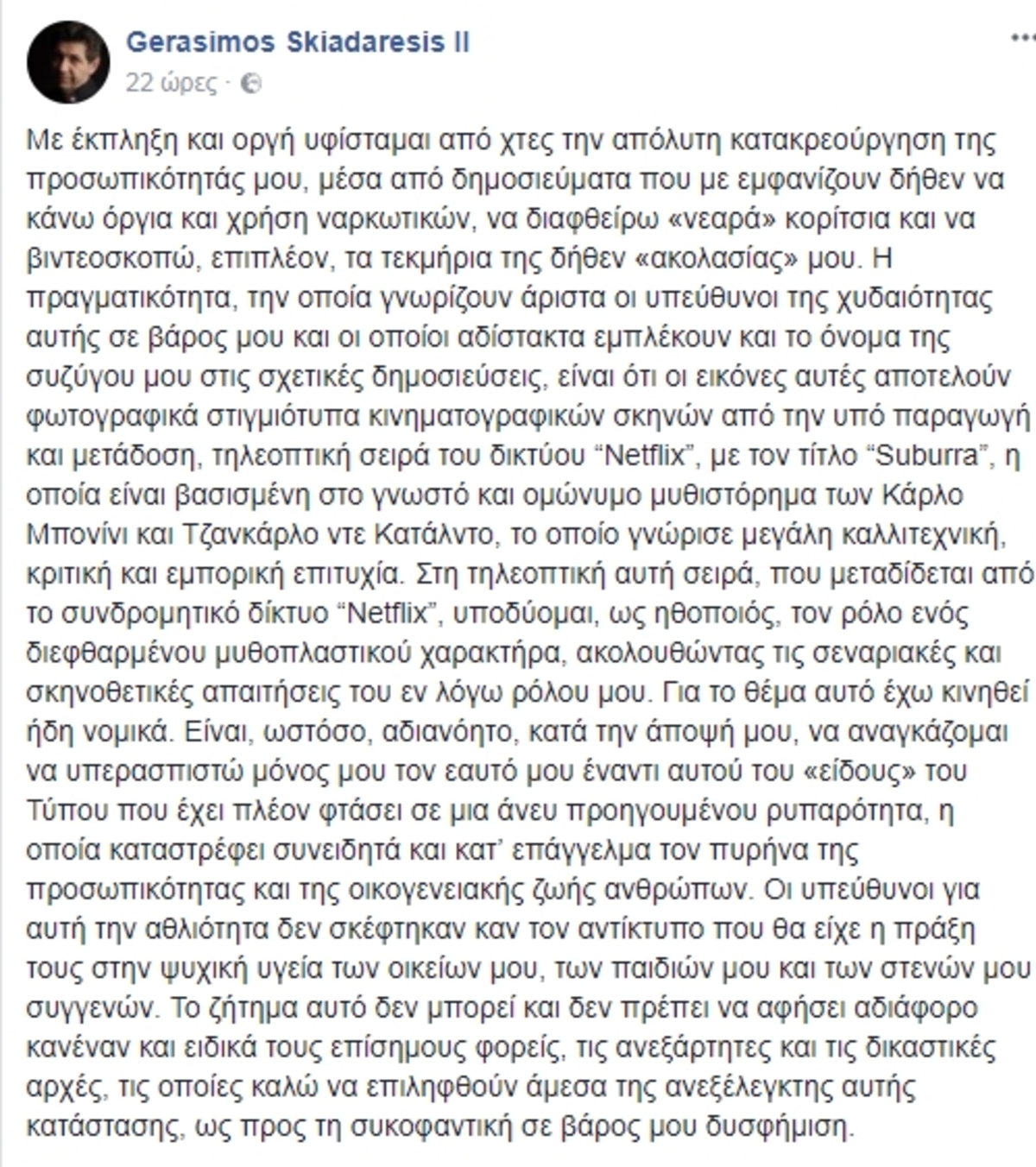 Με ένα μήνυμα του στο λογαριασμό του στο Facebook, ο Γεράσιμος Σκιαδαρέσης ξεσπά για τα δημοσιεύματα των προηγούμενων ημερών και ενημερώνει πως έχει ήδη κινηθεί νομικά για τη συκοφαντική σε βάρος του δυσφήμιση.