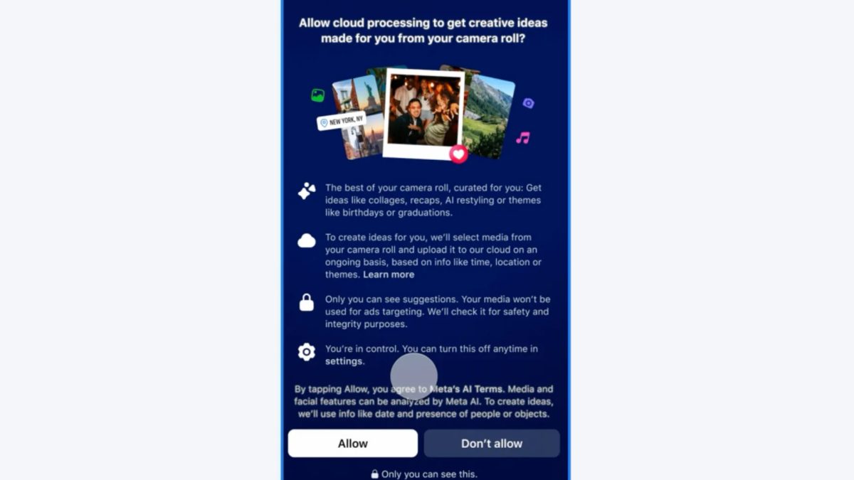 Με άλλα λόγια, το AI μπορεί να έχει πρόσβαση στις φωτογραφίες σου στο cloud, αλλά, σύμφωνα με τη Meta, δεν θα τις χρησιμοποιήσει για εκπαίδευση, εκτός αν κάνεις ενεργά επεξεργασία ή κοινοποίηση. Παρ’ όλα αυτά, το σύστημα θα «σκανάρει» το camera roll σε συνεχή βάση, ανεβάζοντας δεδομένα στους servers της Meta για να προτείνει νέο περιεχόμενο.
