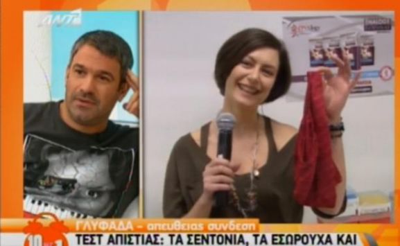 Με το εσώρουχο του Σπύρου Χαριτάτου που το υποδείκνυε υπερήφανα η δημοσιογράφα , ξεκίνησε το ρεπορτάζ της εκπομπής “10 με 1 μαζί” στον ΑΝΤ1. Αντικείμενο του ρεπορτάζ , το ” τεστ απιστίας” η οποιασδήποτε άλλης λέξης με την ίδια κατάληξη χρησιμοποιήσετε.