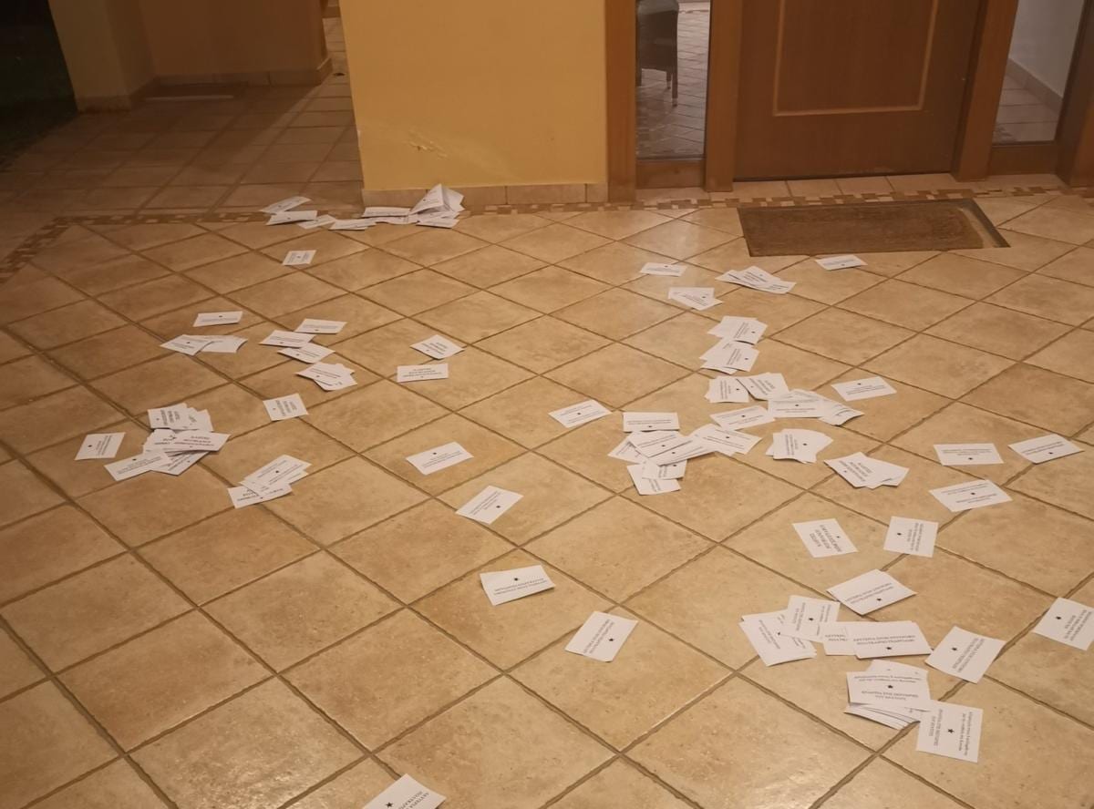 Όπως είπε ο Άρης Πορτοσάλτε ενημερώθηκε από τους γείτονές του ότι κουκουλοφόροι έφτασαν στο σπίτι γύρω στις 23.15 το βράδυ του Σαββάτου, έγραψαν συνθήματα στην είσοδο της πολυκατοικίας και πέταξαν τρικάκια.