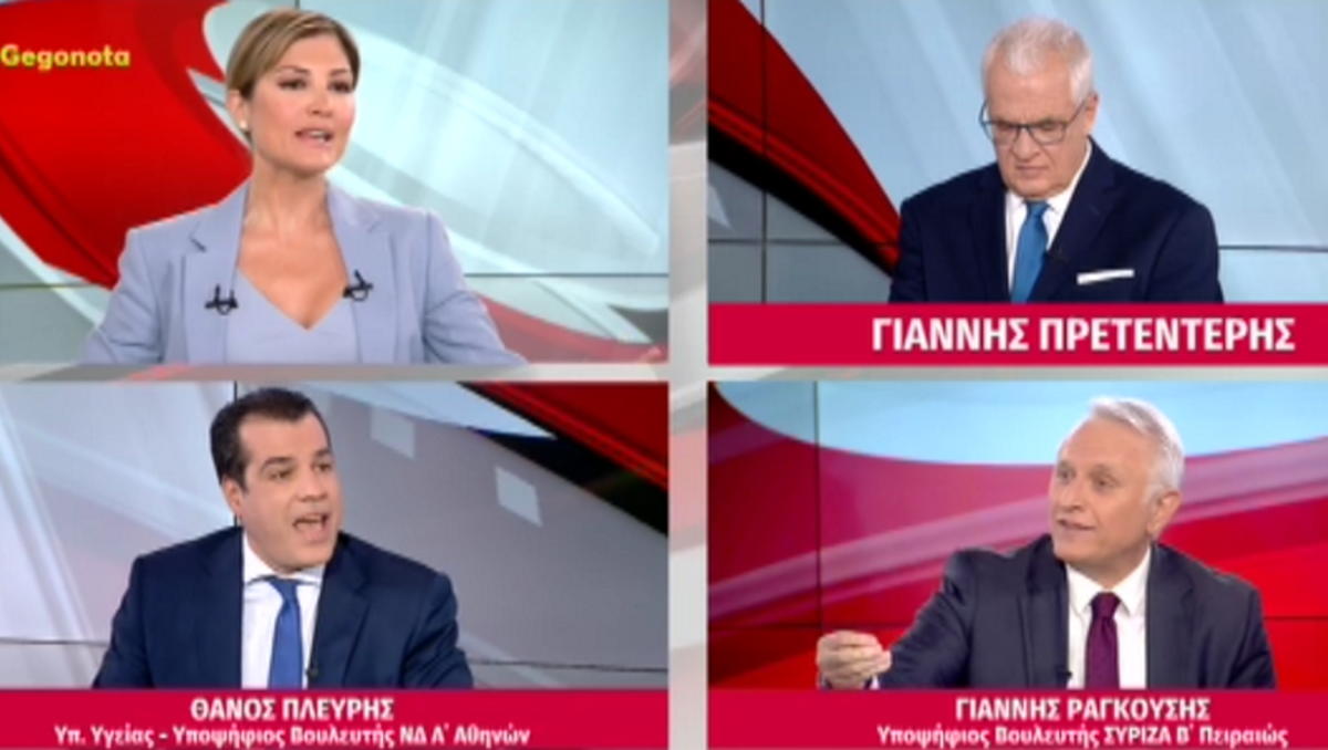 Λίγα 24ωρα πριν τις Εκλογές 2023, το βράδυ της Πέμπτης, η Ράνια Τζίμα υποδέχθηκε στο πλατό του κεντρικού δελτίου ειδήσεων του MEGA τον υπουργό Υγείας και υποψήφιο βουλευτή της ΝΔ, Θάνο Πλεύρη και τον θυυποψήφιο βουλευτή του ΣΥΡΙΖΑ, Γιάννη Ραγκούση.