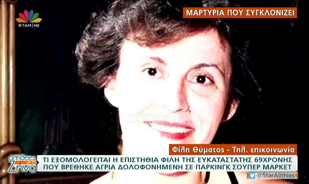 «Γνώρισα την κυρία Ελευθερία Αγραφιώτου στο νοσοκομείο πριν μια πενταετία που είχα τον πατέρα μου άρρωστο και εκείνη είχε τη μητέρα της. Η τελευταία επικοινωνία με την κυρία Αγραφιώτου ήταν 14 Απριλίου και είχαμε συνεννοηθεί να βγούμε για καφέ. Εγώ έπαιρνα τηλέφωνο από το χωριό και δεν το σήκωνε το τηλέφωνο κανένας στο σπίτι, ούτε το κινητό τηλέφωνο σήκωνε. Εντάξει δεν έδωσα σημασία. Βλέπω από την τηλεόραση ότι είχε εξαφανιστεί, αλλά δεν υπολόγιζα ότι θα έφτανε σε αυτό το τραγικό τέλος» διηγείται φίλη του 69χρονου θύματος, της Ελευθερίας Αγραφιώτου, η οποία βρέθηκε άγρια δολοφονημένη σε υπόγειο πάρκινγκ σουπερμάρκετ στο Μαρούσι.