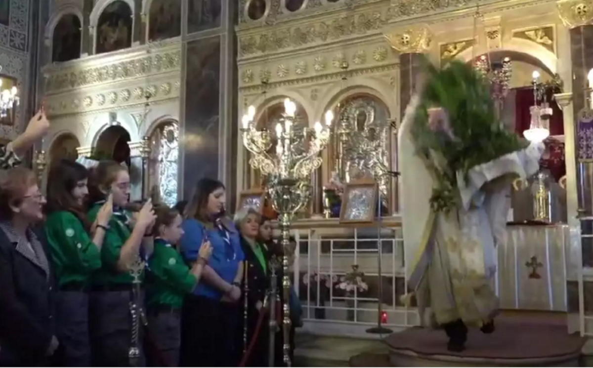 Ο ιερέας σκόρπισε δαφνόφυλλα, σύμβολα της νίκης του Χριστού.