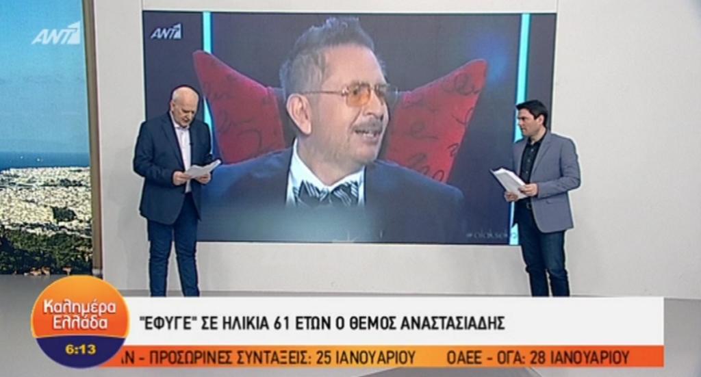 “Έφυγε από τη ζωή ένας συνάδελφός μας, μια εμβληματική μορφή της δημοσιογραφίας, ο Θέμος Αναστασιάδης. Έφυγε πολύ νέος ο Θέμος, στα 61 του χρόνια. Τον Θέμο τον ξέρω χρόνια, από τότε που έγραφε στην Ελευθεροτυπία τη Μαύρη Τρύπα… Πολλές φορές βρέθηκα κι εγώ καλεσμένος στην εκπομπή του, φίλος μου ήταν ο Θέμος. Έφυγε νικημένος από τον καρκίνο, έδωσε τη μάχη του τον τελευταίο χρόνο. Τους τελευταίους 5 μήνες τον κατέβαλε η ασθένεια και δυστυχώς έφυγε από τον μάταιο τούτο κόσμο. Θέμο, πήγαινε πάνω και κάνε τους να σκάσουν στα γέλια και με τον σαρκασμό και με τον αυτοσαρκασμό, ο οποίος σε διέκρινε”, είπε συγκινημένος ο Γιώργος Παπαδάκης.