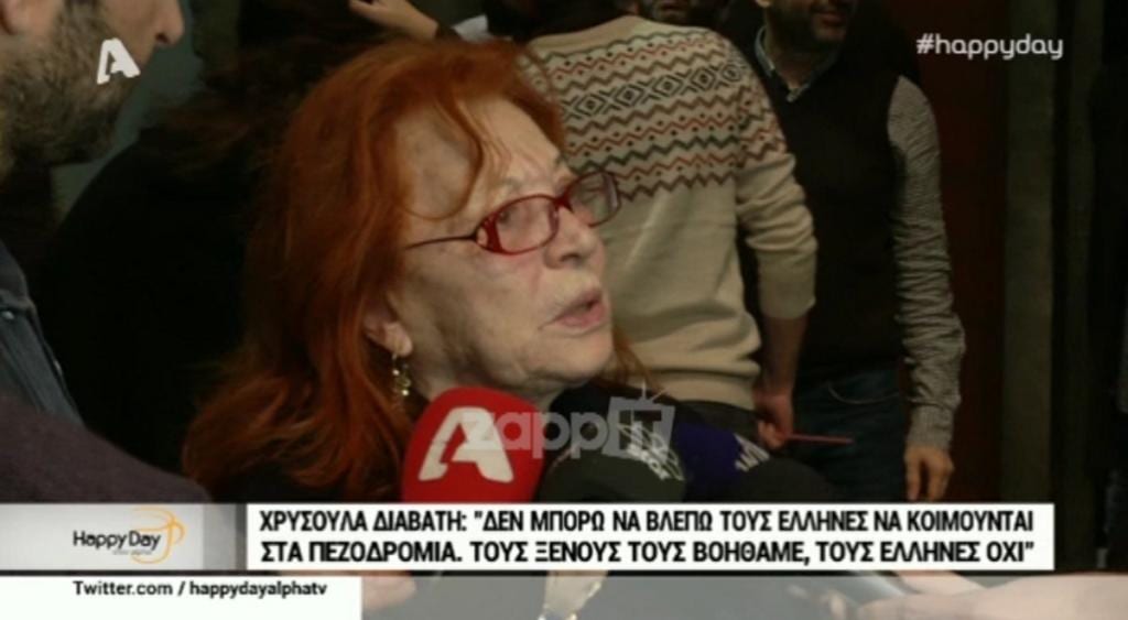 Η Χρυσούλα Διαβάτη εξέφρασε την άποψή της για τους Έλληνες που κοιμούνται στα πεζοδρόμια, κάνοντας παράλληλα σύγκριση με τους μετανάστες και τη βοήθεια που δέχονται. Η Χρυσούλα Διαβάτη δήλωσε τα εξής: