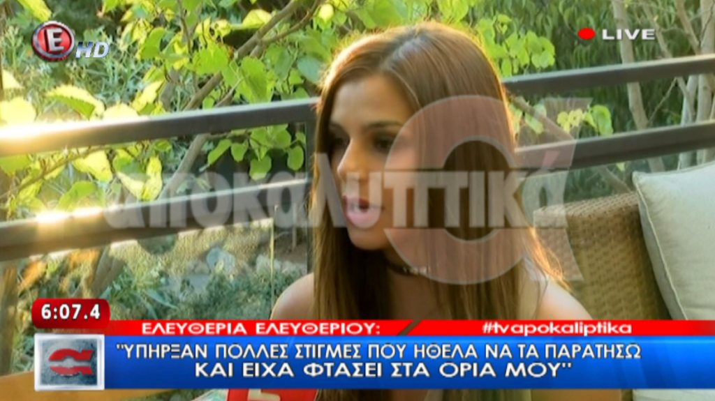 Η Ελευθερία Ελευθερίου ευτυχώς ξεπέρασε το πρόβλημα και στέλνει το δικό της μήνυμα: «Το πρόλαβα. Ξύπνησα μια μέρα και λέω: ΟΚ, πρέπει να βρεις τον εαυτό σου. Απομονώθηκα στον εαυτό μου 5-6 μήνες και λέω: Θα ασχοληθώ με την Ελευθερία, την υγεία της και τίποτα άλλο».