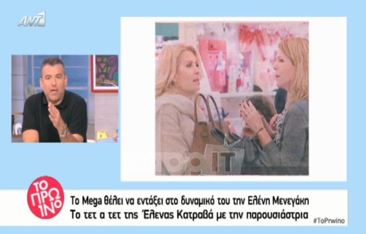 Η Ελένη Μενεγάκη συνάντησε την Έλενα Κατραβά και ο φωτογραφικός φακός της “Real” απαθανάτισε τη στιγμή. Η παρουσιάστρια του Alpha και η επί 20 χρόνια υπεύθυνη των ψυχαγωγικών εκπομπών του Μega είναι πάρα πολλά χρόνια φίλες, από τα πρώτα τηλεοπτικά βήματα της Ελένης στο Μεγάλο Κανάλι. Σύμφωνα με το ρεπορτάζ της Ναταλίας Ανδρικοπούλου, στελέχη του σταθμού έχουν ήδη προσεγγίσει την Ελένη Μενεγάκη, προκειμένου να την πείσουν να μετακινηθεί στη Μεσογείων.