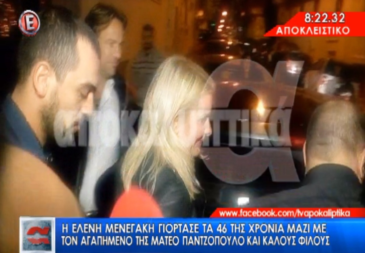 Η Ελένη Μενεγάκη έκλεισε την περασμένη Πέμπτη τα 46 της χρόνια και το γιόρτασε μαζί με τον σύντροφό της Ματέο Παντζόπουλο, αλλά και τους κουμπάρους της Ελμίνα Κοπελούζου και Κωνσταντή Σπυρόπουλο που ετοίμασαν και την τούρτα της. Η εκπομπή «Αποκαλυπτικά» συνάντησε το ζευγάρι κατά την έξοδο του από το μαγαζί και ευχήθηκαν στην παρουσιάστρια για τα γενέθλια της.
