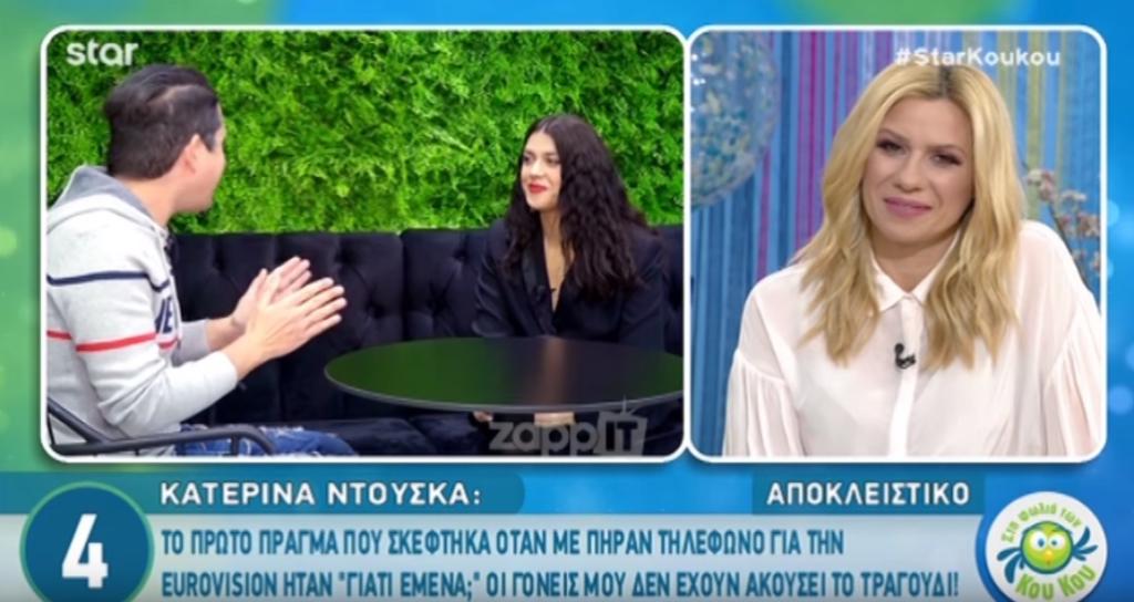 Τι ήταν το πρώτο πράγμα που είπε όταν της πρότειναν να εκπροσωπήσει την Ελλάδα στη Eurovision 2019; «Πραγματικά, δεν θυμάμαι αν το είπα αυτό, αλλά σίγουρα το πρώτο πράγμα που σκέφτηκα ήταν «Γιατί εμένα;». Γιατί σίγουρα δεν ήμουν η συμβατική επιλογή, τουλάχιστον για την Ελλάδα τα τελευταία χρόνια. Μου είπαν θέλουμε εσένα, θέλουμε αυτό που κάνεις, θέλουμε να πας με ένα δικό σου τραγούδι. Όλα αυτά για εμένα ήταν πολύ σημαντικά για να το σκεφτώ πολύ σοβαρά. Τους έστειλα τρία τραγούδια που θεωρούσα ότι μπορώ να φανταστώ σίγουρα στη Eurovision. Τα αγαπώ και τα τρία πολύ, αλλά κάτι μου έλεγε ότι το τραγούδι το πιο κατάλληλο ήταν αυτό στο οποίο καταλήξαμε. Δεν θα είμαι μόνη μου επί σκηνής. Θα είναι γυναικεία υπόθεση», αποκάλυψε μεταξύ άλλων η Κατερίνα Ντούσκα.