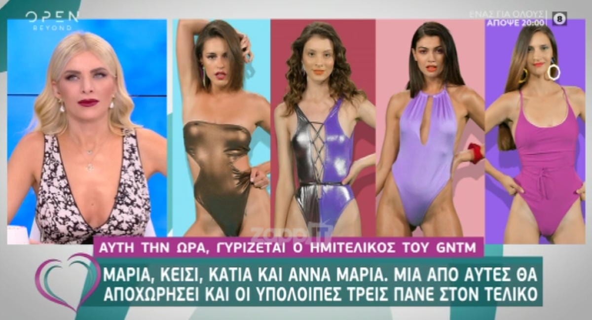 Αυτή την ώρα γυρίζεται στην Αθήνα ο ημιτελικός του GNTM. Σύμφωνα με τα spoiler, όπως παρουσιάστηκαν στην εκπομπή Ευτυχείτε, από τα τέσσερα κορίτσια που έφτασαν στον ημιτελικό, Μαρία Μιχαλοπούλου, Κάτια Ταραμπάνκο, Κέισι Μίζιου, Άννα Μαρία Ηλιάδου, μετά από τις δύο δοκιμασίες στο Μιλάνο αποχωρεί η Μαρία.