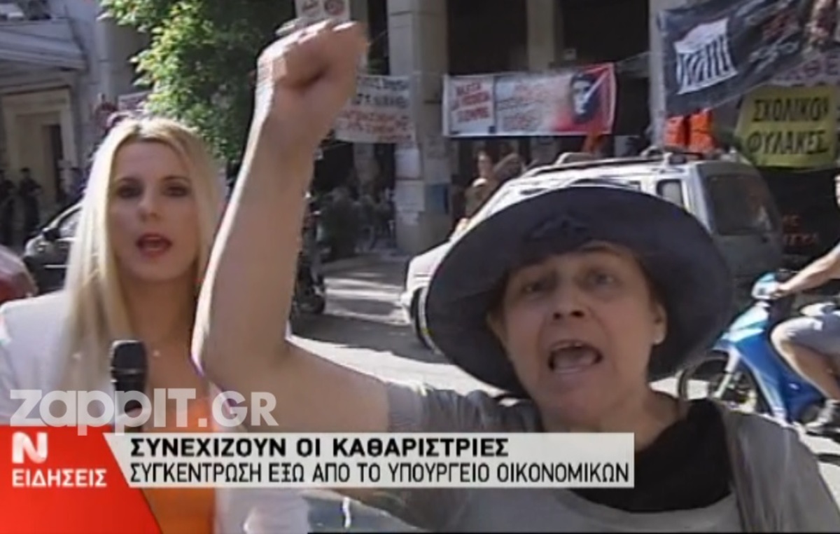 Το απογευματινό δελτίο είδήσεων της ΝΕΡΙΤ “τίναξε στον αέρα” η Ελένη Λουκά όταν όρμησε στην κάμερα κατά τη διάρκεια της ζωντανής σύνδεσης με το υπουργείο Οικονομικών που βρίσκονται συγκεντρωμένες οι καθαρίστριες.