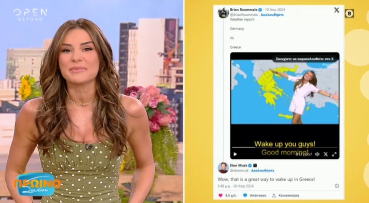 Χαμός έχει γίνει από προχθές με τον Elon Musk, που σχολίασε στο twitter ένα βίντεο με την Ελένη Τσολάκη, όταν η παρουσιάστρια έλεγε τον καιρό στο Happy Day.