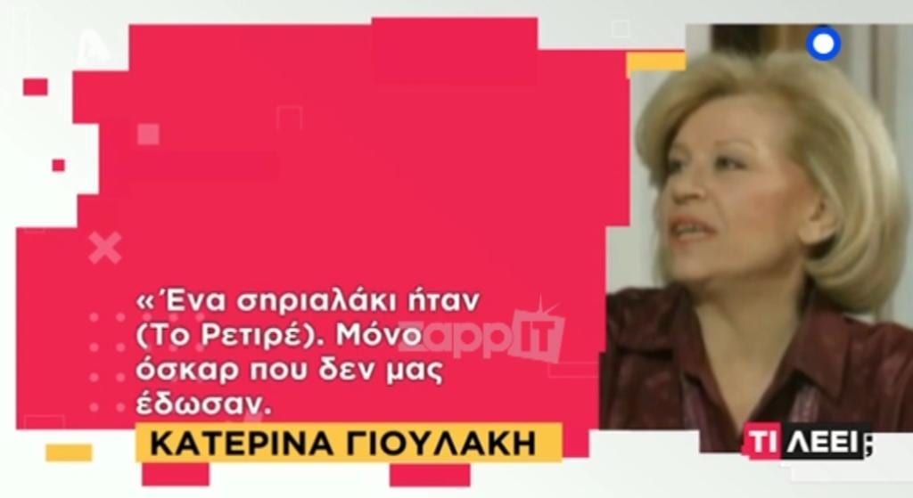 «Είπα stop. Εγώ έχω κρεμάσει τα παπούτσια μου σαν τους ποδοσφαιριστές. Τελείωσα εγώ με την τηλεόραση, με το θέατρο, με τις τηλεοπτικές εμφανίσεις. Τέρμα. Ήθελα να με θυμούνται οι άνθρωποι όπως ήμουν παλιά, όχι όπως τώρα που είμαι μια παλιόγρια. 80 ετών είμαι. Θα μου πεις ο Βουτσάς είναι 87 και δουλεύει ακόμα. Δεν κάνω κριτική για κανένα συνάδελφο για όνομα του Θεού!» καταλήγει η Κατερίνα Γιουλάκη.