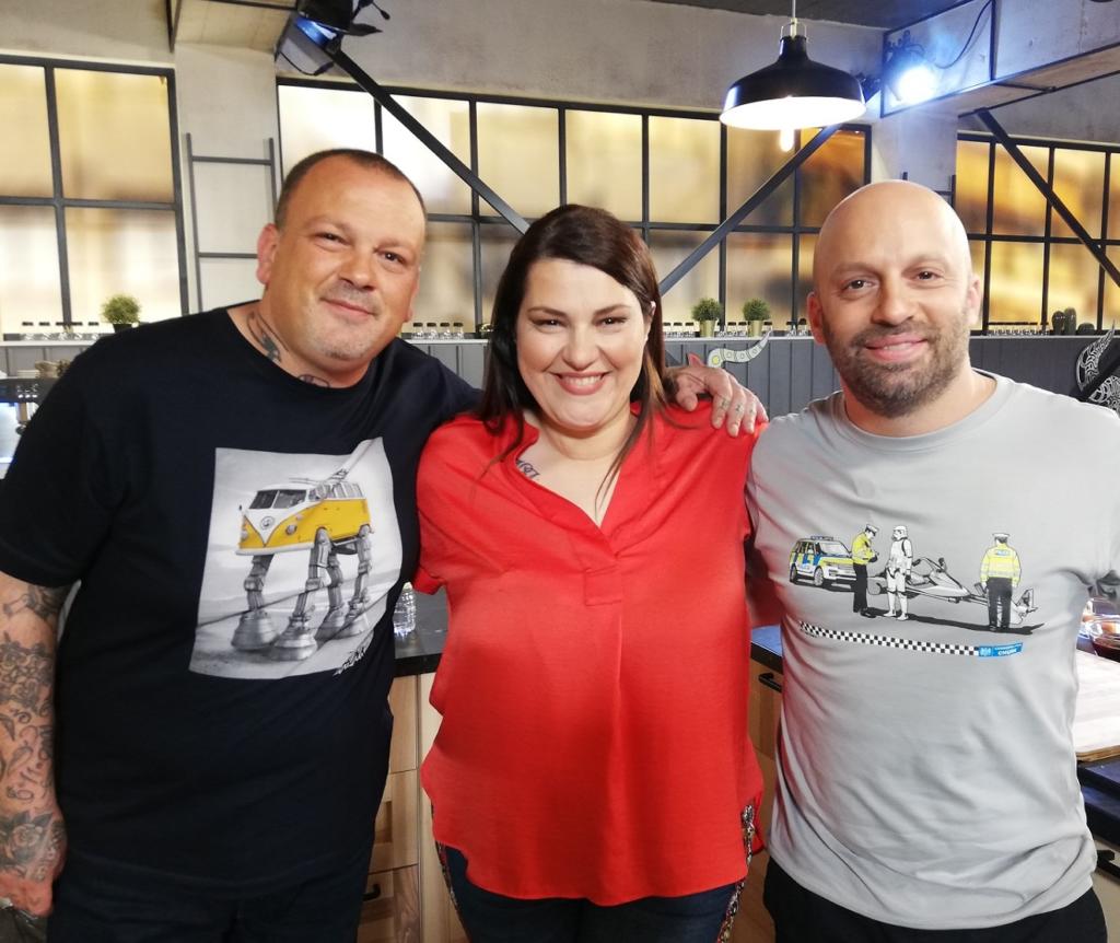 Ο Δημήτρης Σκαρμούτσος και ο Ηλίας Φουντούλης προσπαθούν να διαχειριστούν το εκρηκτικό χιούμορ της και μαγειρεύουν μαζί της μια “τούρτα” ντάκου με ξινομυζήθρα και ένα λαχταριστό κοτόπουλο παστιτσάδα με χοντρά μακαρόνια.